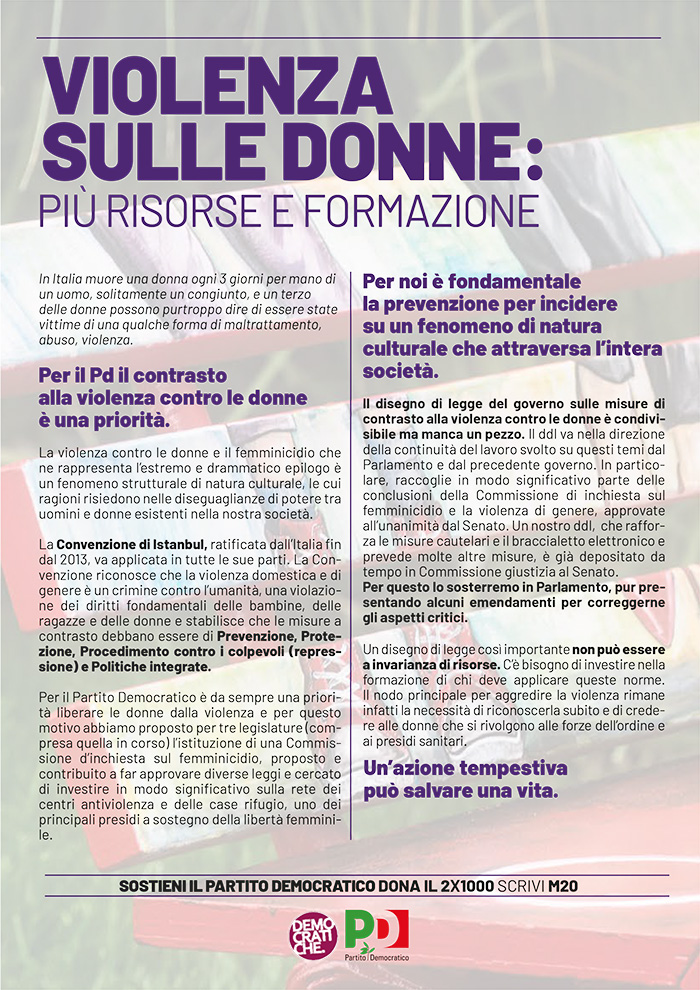 Per il Partito Democratico il contrasto alla violenza contro le donne è una priorità.